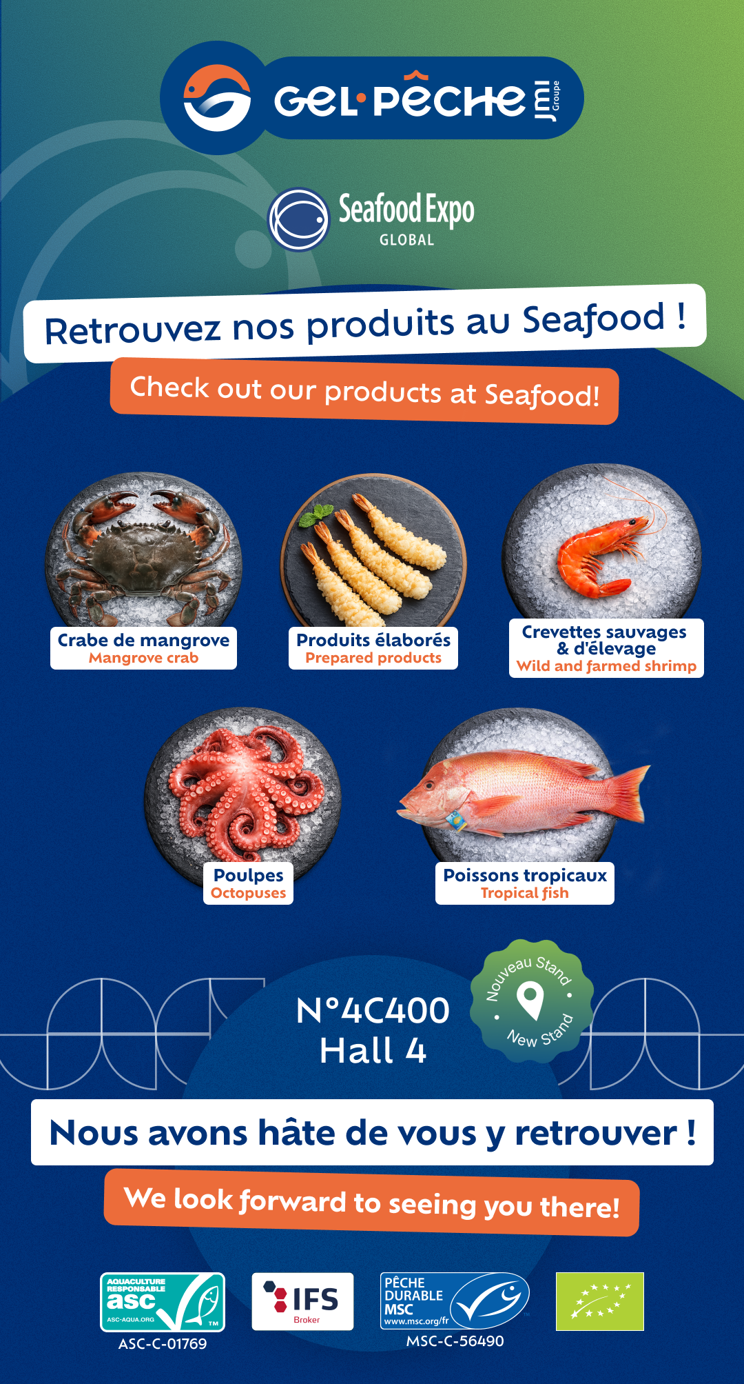 At Gel-Pêche, this trade show is a unique opportunity to highlight our strengths: rigorous sourcing, a wide range of frozen tropical seafood products, and a constant commitment to quality and sustainability.